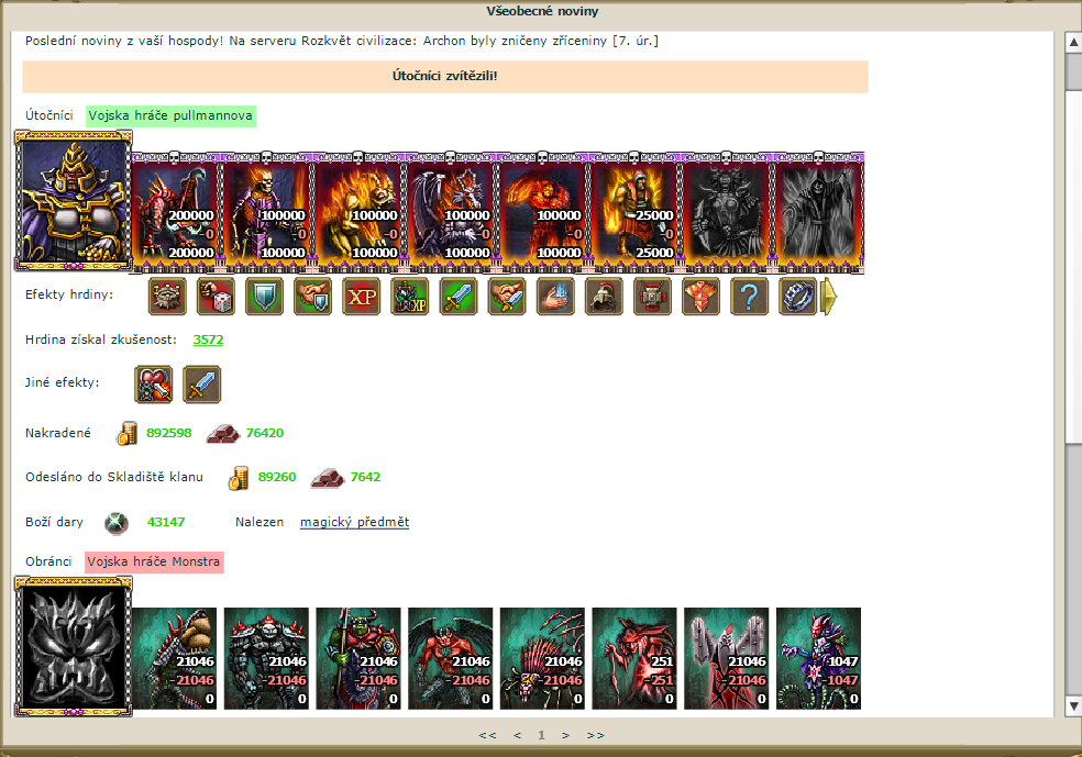 Po dlouhém zuřivém boji náhle zavládlo hrobové ticho. Všude ležela těla padlých obránců, jen místy bylo ještě slyšet slabé sténání těch, kteří se nacházeli mezi životem a smrtí. Těm pomohli na onen svět vojíni, kteří jim svými meči pomohli ukončit to utrpení. Naši léčitelé provedli magický obřad, aby poléčili a vrátili k životu tu hrstku našich zraněných a padlých. Den voněl ocelí a krví, voněl očekáváním..........očekáváním, lepších časů. Naši nosiči se ihned jali nakládat neuvěřitelné bohatství, které tu monstra zanechala.